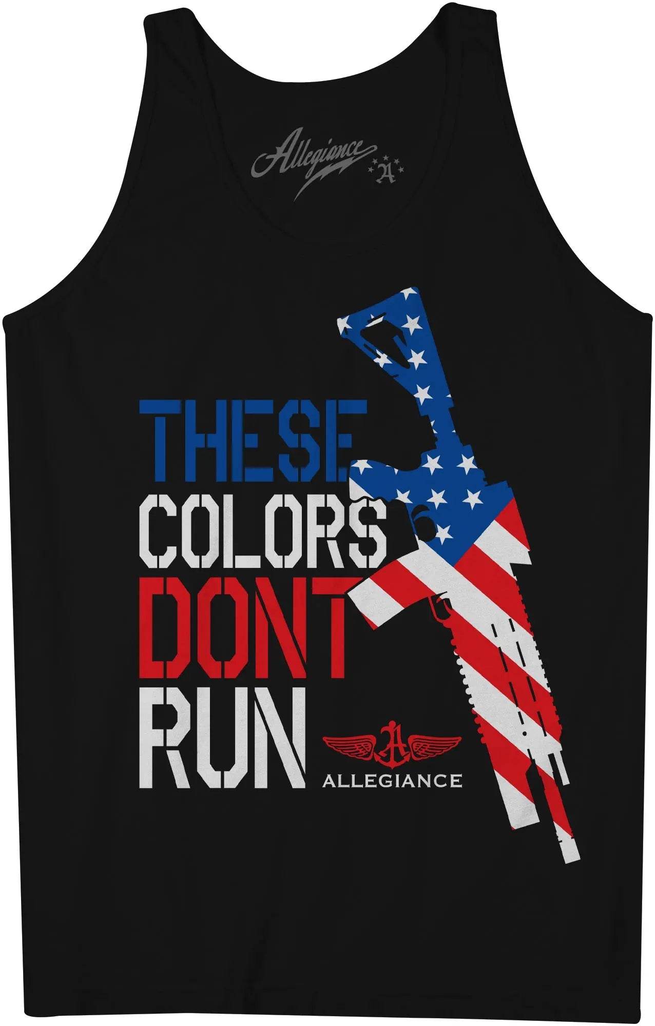 Allegiance Clothing. The Allegiance Don't Run Tank Top. Allegiance Don't Run art print screened on front. Available in black and white. Crew neck. 100% cotton. Machine wash. Designed and printed in the USA.