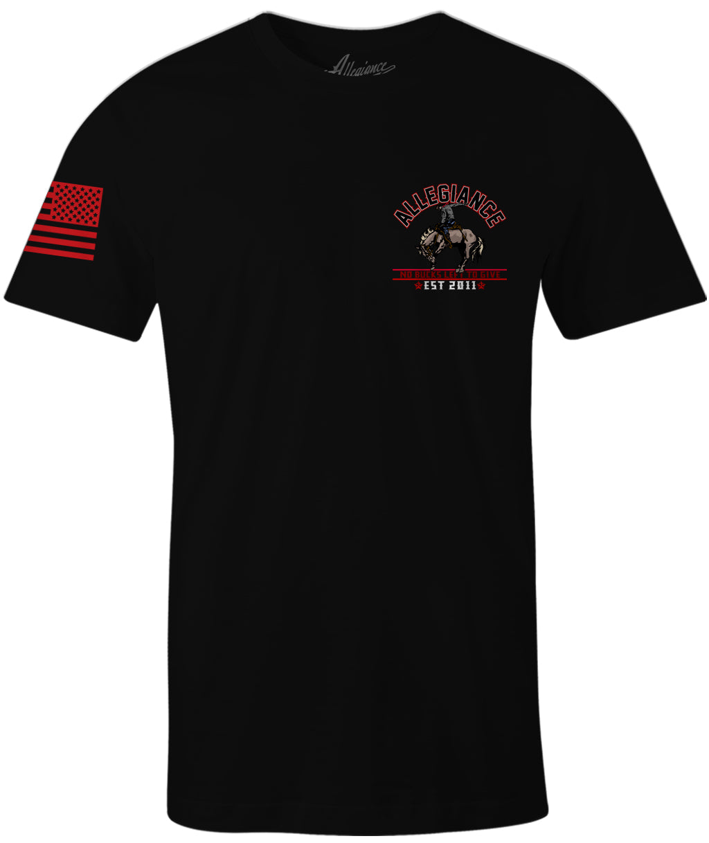 Ride hard and let your grit show with the Bucked Classic Graphic Tee. This bold design features a cowboy gripping tight while a bucking horse kicks beneath him. Below the action, the phrase “No Bucks Left to Give” says it all without apology. The Allegiance logo above the scene adds bold branding, while the American flag on the sleeve drives the message home.