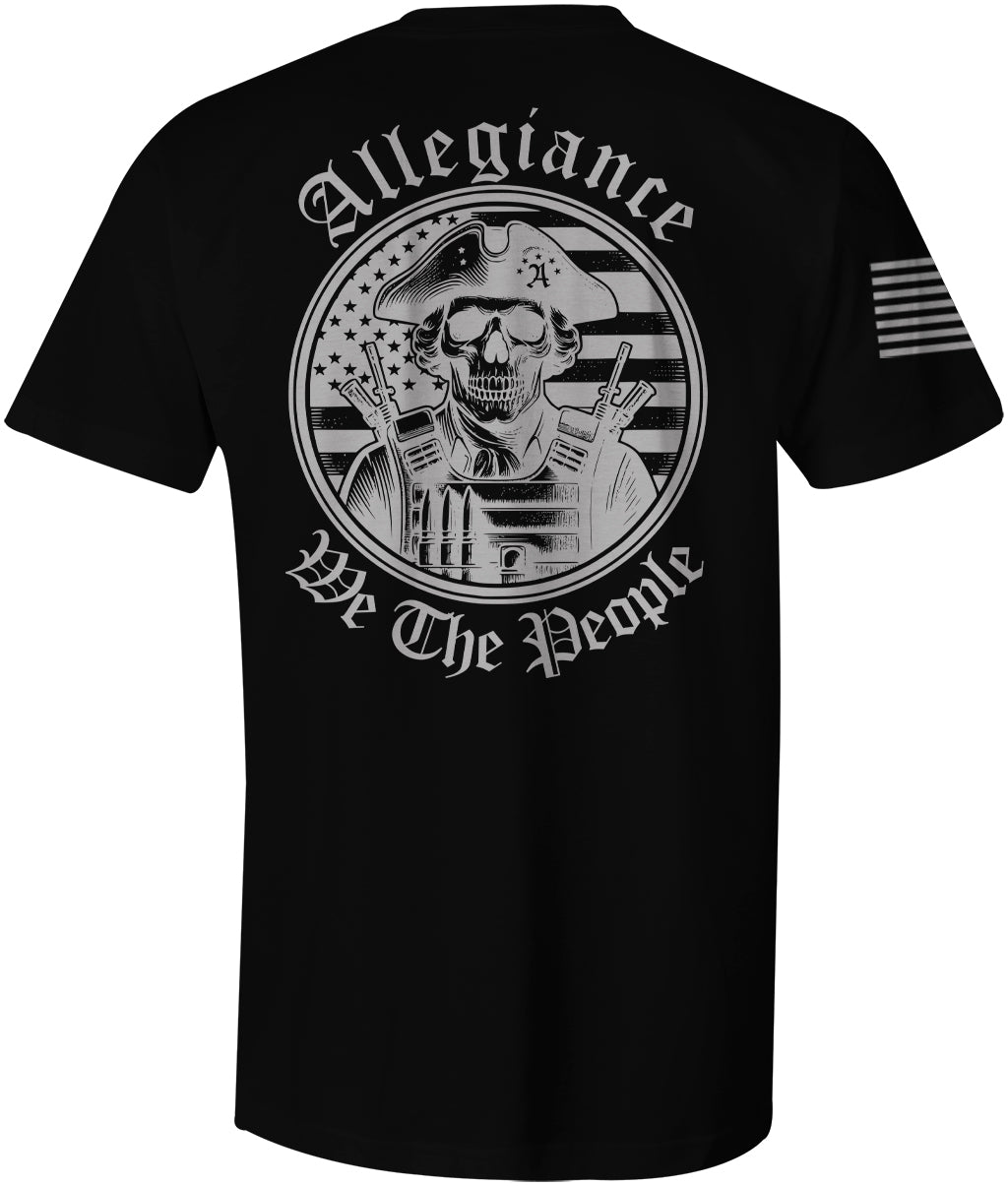 Stand tall and say it with your chest. The Allegiance We The People Tee delivers a bold statement of grit, loyalty, and freedom. This shirt features a skull-faced patriot in a tricorn hat as he stares forward with intensity. He wears tactical armor and grips two rifles. Meanwhile, a blacked-out American flag sets the tone behind him.