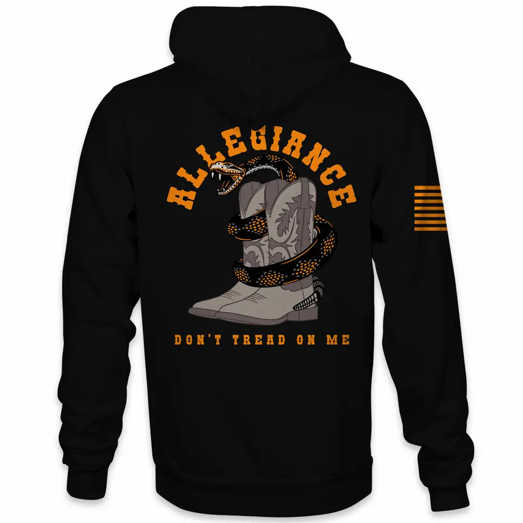 Show your Western pride with the Allegiance Western Hoodie. To begin with, this bold design features a rattlesnake coiled tightly around a cowboy boot, paired with the words “Don’t Tread On Me.” As a result, the artwork delivers a fearless mix of patriotism and rugged Western grit. Meanwhile, the Allegiance name arcs proudly above the design, making the hoodie instantly recognizable.