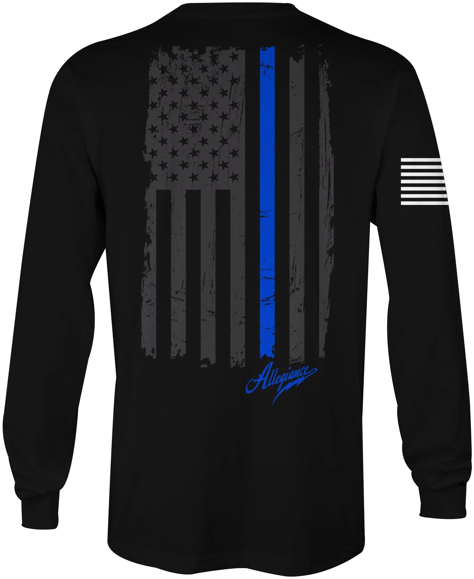 Elevate your support for our police officers with the Allegiance Men's Back the Blue Long Sleeve Tee. This long sleeve tee is the perfect choice for displaying your unwavering commitment to our law enforcement. The Back the Blue logo is expertly screen-printed, with a small print on the front chest, a larger statement on the back shoulder, and an impactful American flag printed on the sleeve. Crafted from 100% cotton, this tee provides a comfortable and cozy fit. It's also machine washable for effortless care, ensuring it remains in top condition. Whether you're donning it for casual everyday wear or as part of your activewear, this long sleeve tee is sure to keep you comfortable throughout the day. Join the ranks of those supporting law enforcement and make a statement with the Back the Blue Long Sleeve Tee from Allegiance. Designed and printed in the USA.