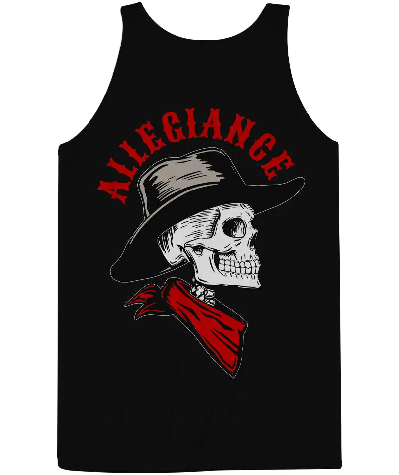 Looking for a tank that will show your patriotic side? Look no further than the Allegiance Cowboy Tank! The Cowboy tank features a skeleton head wearing a cowboy hat and bandana screen printed small on the front and big on the back. It's available in black, and is made of 100% cotton. With a relaxed fit, you'll be comfortable no matter what you're doing. Show your allegiance to the USA with this stylish tank today! Designed and printed in the USA.