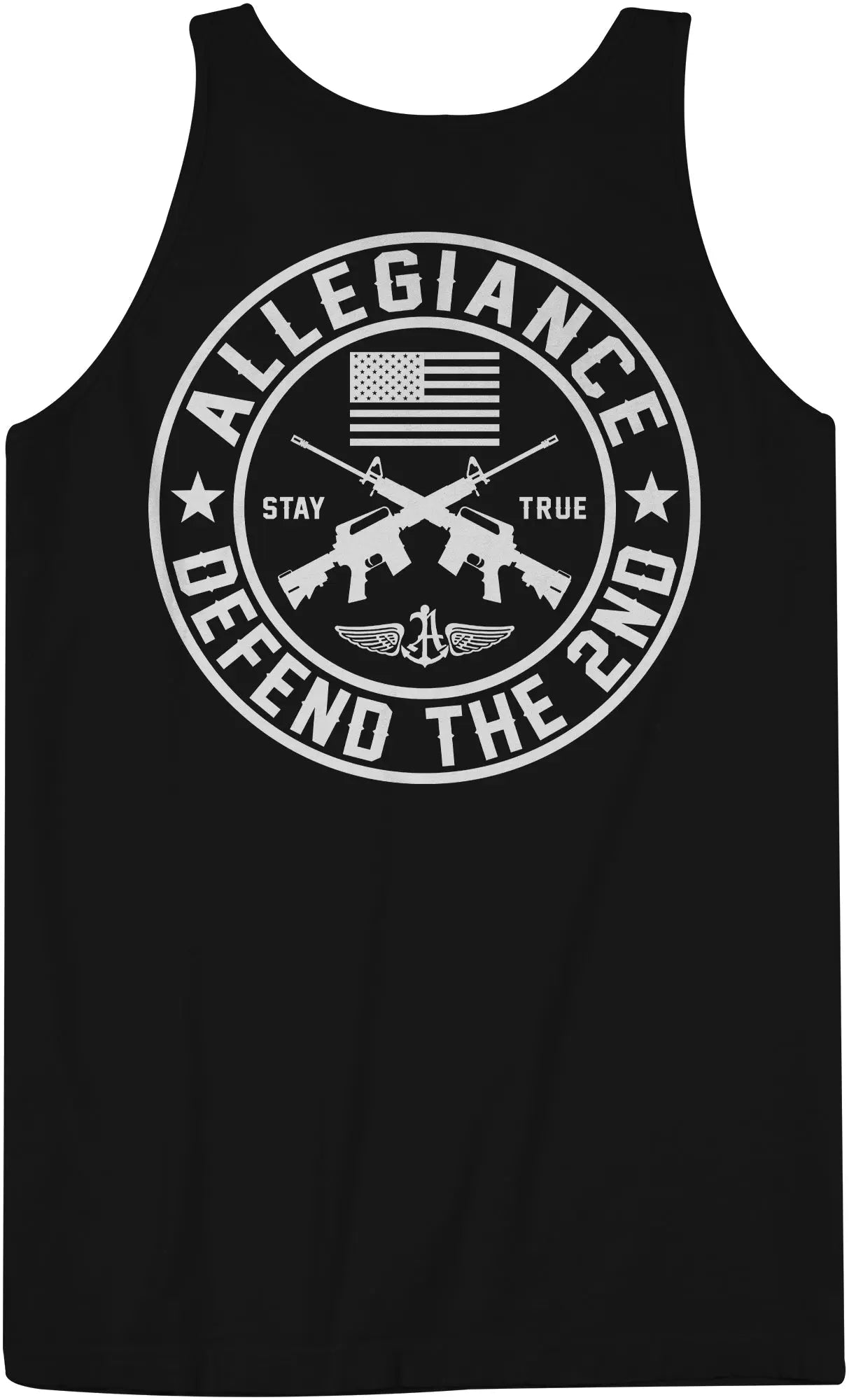 Allegiance Clothing. The Allegiance Defend the Second Back Hit Tank Top. Allegiance Defend the Second Back Hit  art print screened small on the front and a big hit on the back. Available in black and white. Crew neck. 100% cotton. Machine wash. Designed and printed in the USA.