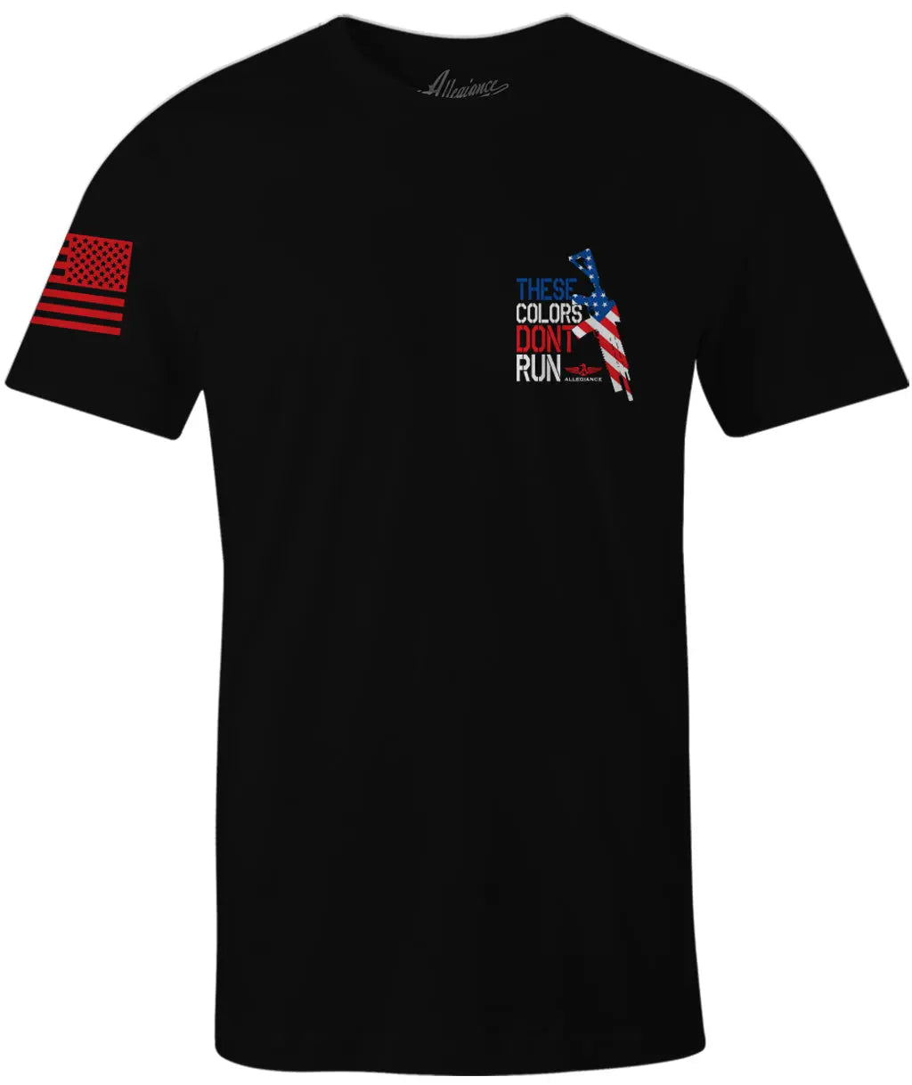 Show your patriotic pride with the Allegiance Don’t Run Back Hit Tee. This bold design features the powerful phrase “These Colors Don’t Run” alongside a rifle filled with the American flag pattern. The back print makes a striking statement, while the American flag on the sleeve reinforces the message of loyalty and strength.