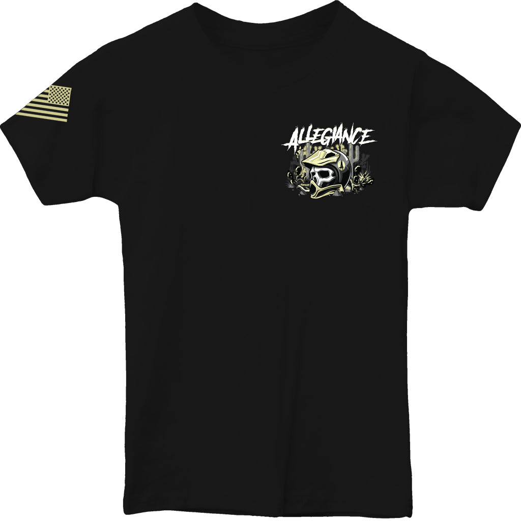 Let your young adventurer embrace bold style with the Allegiance "Desert Skull Youth Tee." This dynamic design features a striking graphic of a skull in a motocross helmet surrounded by desert elements like cacti and rugged terrain. The back of the tee makes a bold statement with the large graphic and the iconic Allegiance logo, while the front keeps it simple with a smaller version of the design. An American flag adorns the sleeve, adding a patriotic touch. Crafted from soft and durable 100% cotton, this tee is made to keep up with an active lifestyle while providing all-day comfort. Perfect for school, outdoor adventures, or casual everyday wear, the "Desert Skull Youth Tee" is as tough and fearless as the young ones who wear it. At Allegiance Clothing, we’re proud to create apparel that stands for adventure and pride. Designed and printed in the USA, this tee is more than just clothing—it’s a statement of independence and resilience.
