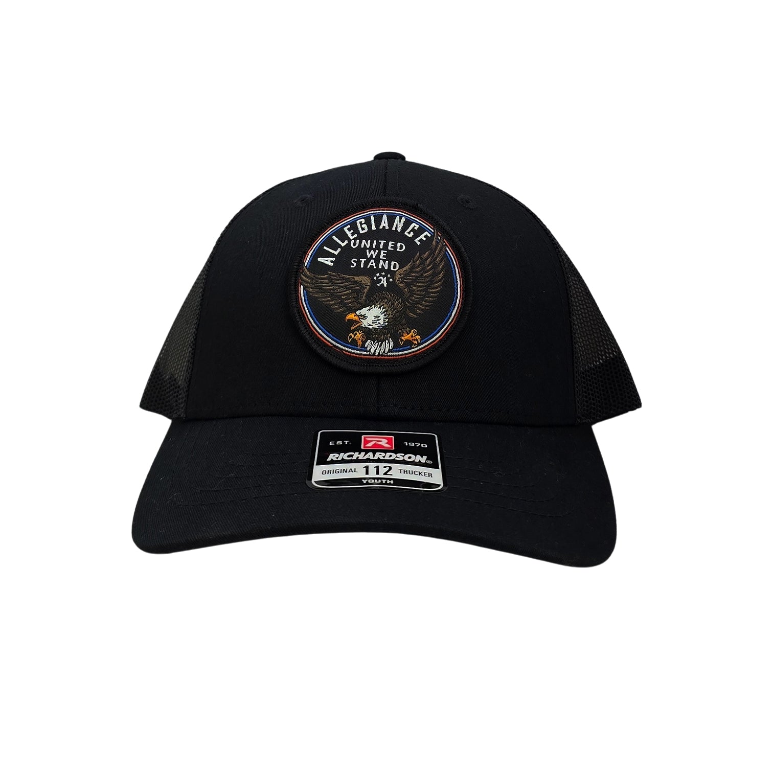 The front features our round Navigator “United We Stand” eagle patch, showcasing a fierce, detailed eagle holding the American flag shield. The colors stand out strong against the structured black crown, giving young patriots a hat that’s rugged, sharp, and full of pride. Mesh back panels keep it breathable, while the snapback closure makes it easy to adjust as they grow.